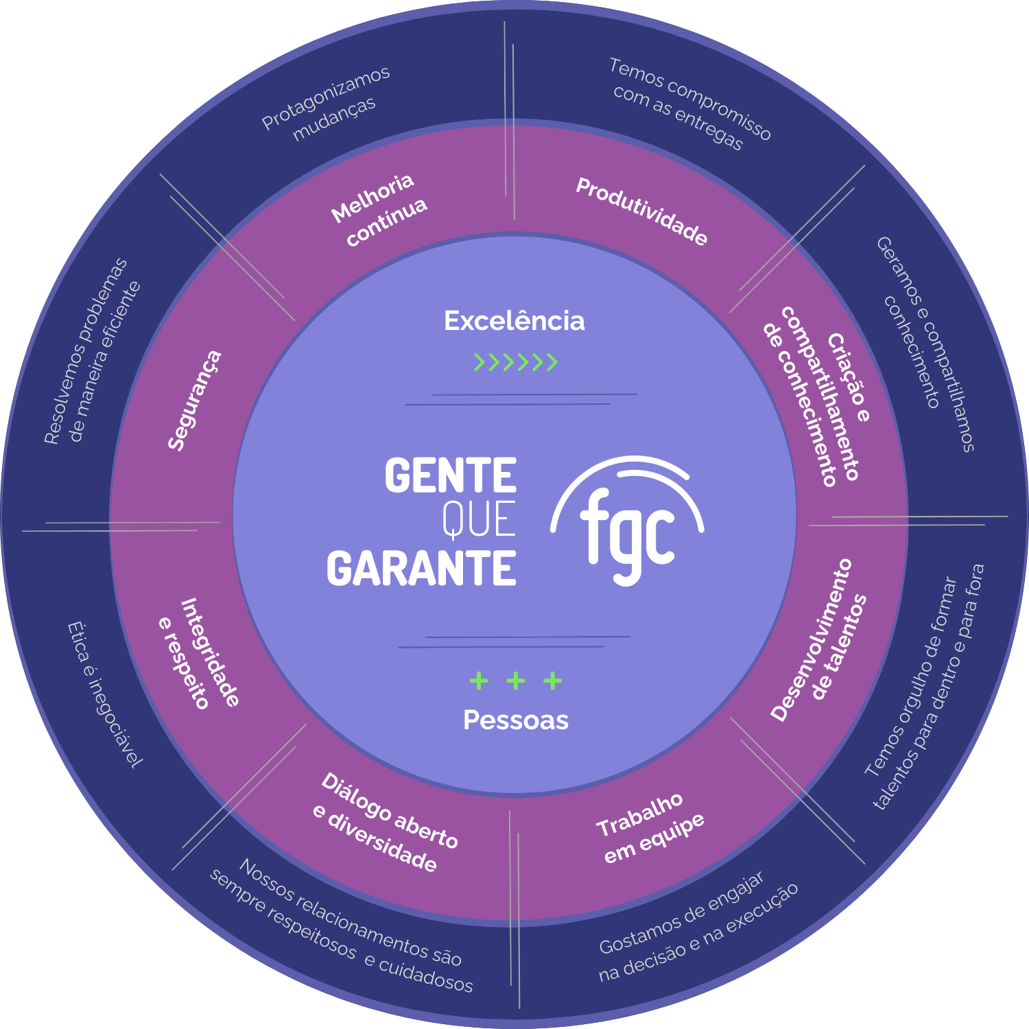 Nossa Cultura é guiada pela valorização das pessoas e pela excelência em tudo o que fazemos e entregamos. É um conjunto de valores e práticas que norteiam e inspiram o comportamento dos colaboradores do FGC em diversos aspectos: sentimentos, percepções, ritos, entre outras questões compartilhadas, que moldam o nosso ambiente como um todo. Corrigimos rotas, priorizamos a que traz mais resultado, pensamos de forma crítica, agimos rápido e entregamos o combinado com excelência, soluções que agregam valor, colocando sempre nossas pessoas à frente de tudo. Este é o nosso jeito FGC de ser.